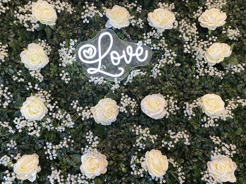 For NO Extra Charge, we will hang a lightweight and preapproved customized "last name" neon (LED) sign onto either the Wedding White Floral Wall or the Green Hedge Wall(s), if you purchase it along with all of the necessary hardware to set it up and hang it. Just be sure to give it to us anytime in advance of the event and remember to take it home with you to enjoy after your event ends.